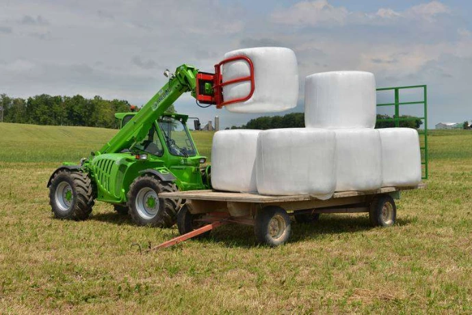 • Specially designed arms grasp a 3’ to 6’ bale firmly without damaging the plastic wrapping.